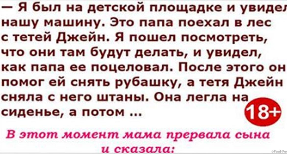 — Я был на детской площадке и увидел нашу машину. Это папа поехал в лес с тетей Джейн. Я пошел посмотреть, что они там будут делать, и увидел, как папа ее поцеловал. После этого он помог ей снять рубашку, а тетя Джейн сняла с него штаны. Она легла на сиденье, а потом папа…