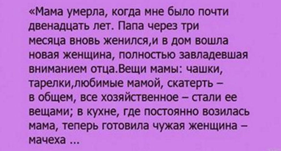 «Мама умерла, когда мне было почти двенадцать лет. Папа через три месяца вновь женился, и в дом вошла новая женщина, полностью завладевшая вниманием отца. Вещи мамы: чашки, тарелки,…
