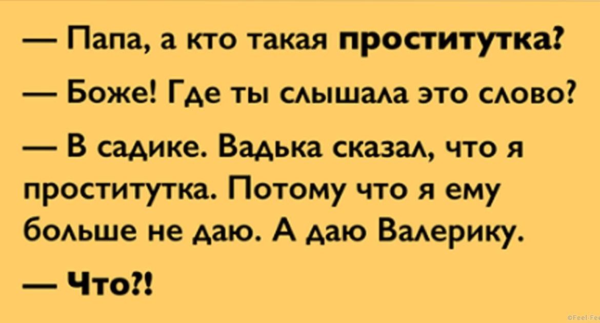— Странно, какая же мама пр@ститутка, если она с дядей Витей спала не за деньги, а по любви?