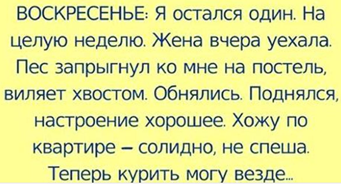ВОСКРЕСЕНЬЕ: Я остался один. На целую неделю. Жена вчера уехала. Пес запрыгнул ко мне на постель, виляет хвостом. Обнялись. Поднялся, настроение хорошее. Хожу по квартире — солидно, не спеша. Теперь курить могу везде. Прикинул распорядок дня. Посчитал, сколько времени уйдет на умывание, бритье, прогулки с собакой. Да у меня еще остается масса свободного времени! Не понимаю, почему жена так часто жалуется на его нехватку? Вечером включил настольную лампу, протер стол свежим полотенцем — создал праздничную обстановку. Уборку, мытье посуды отложил на завтра.