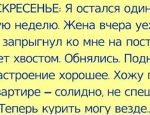 Когда переоценил свою хозяйственность ВОСКРЕСЕНЬЕ: Я остался один. На целую неделю. Жена вчера уехала. Пес запрыгнул ко мне на постель, виляет хвостом. Обнялись. Поднялся, настроение…