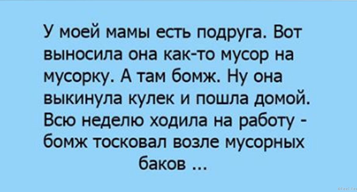У моей мамы есть подруга. Вот выносила она как-то мусор на мусорку. А там бомж. Ну она выкинула кулек и пошла домой.