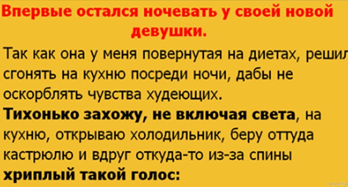 Впервые остался ночевать у своей новой девушки. Так как она у меня повернутая на диетах, решил сгонять на кухню посреди ночи, дабы не оскорблять чувства худеющих. Тихонько захожу, не включая света, на кухню, открываю холодильник, беру оттуда кастрюлю и вдруг откуда-то из-за спины хриплый такой голос: