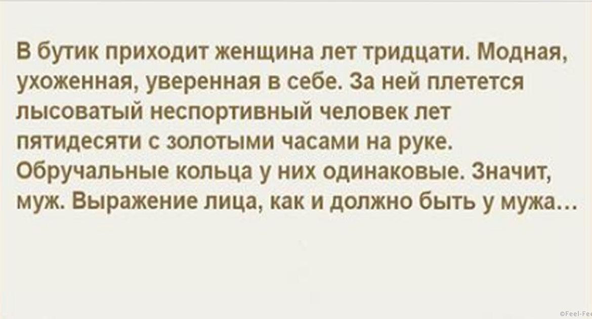 Мораль: Муж уверен, что платье купил он. Любовник убежден, что платье купил он. Никаких вопросов и ревности. А у женщины на руках три штуки баксов и шикарное платье.